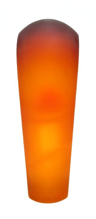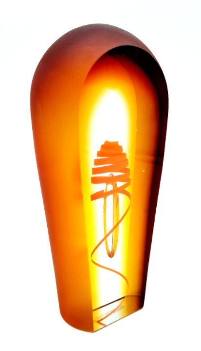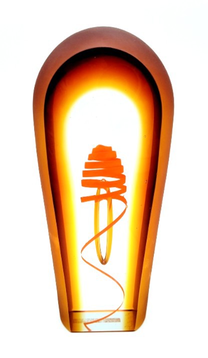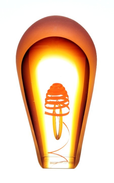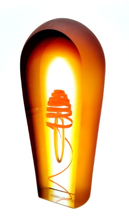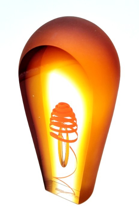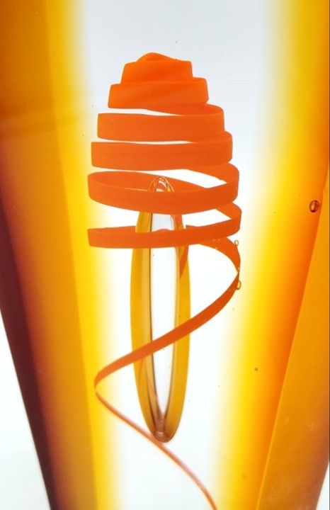 A vibrant twist of orange curls around a central floating bubble in this handblown art glass sculpture.
